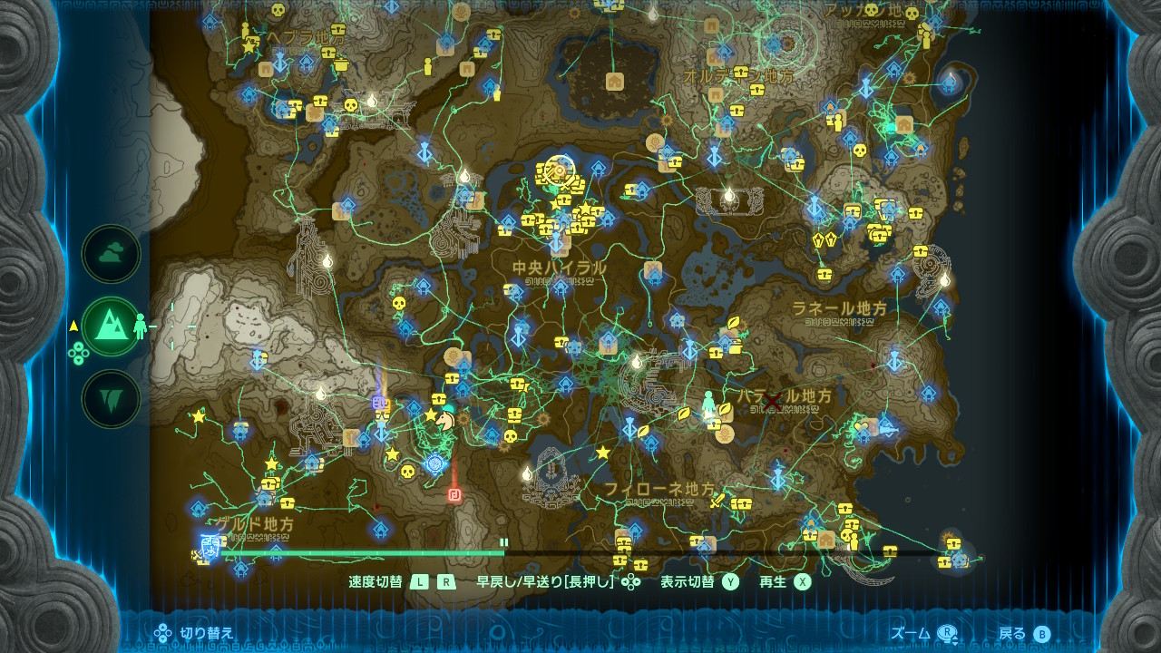ゲルドの地底を少し探索、ハイラル平原あたりの地底を少し探索、デスマウンテン周辺の地底を少し探索、という感じ。