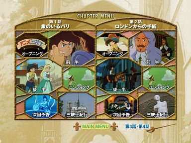 蜂の巣みたいな作り(ステンドグラスを意識したんでしょうね)で、1話ごとにオープニング、前半、後半、エンディング、次回予告、三銃士紀行の6チャプターに分かれてます。